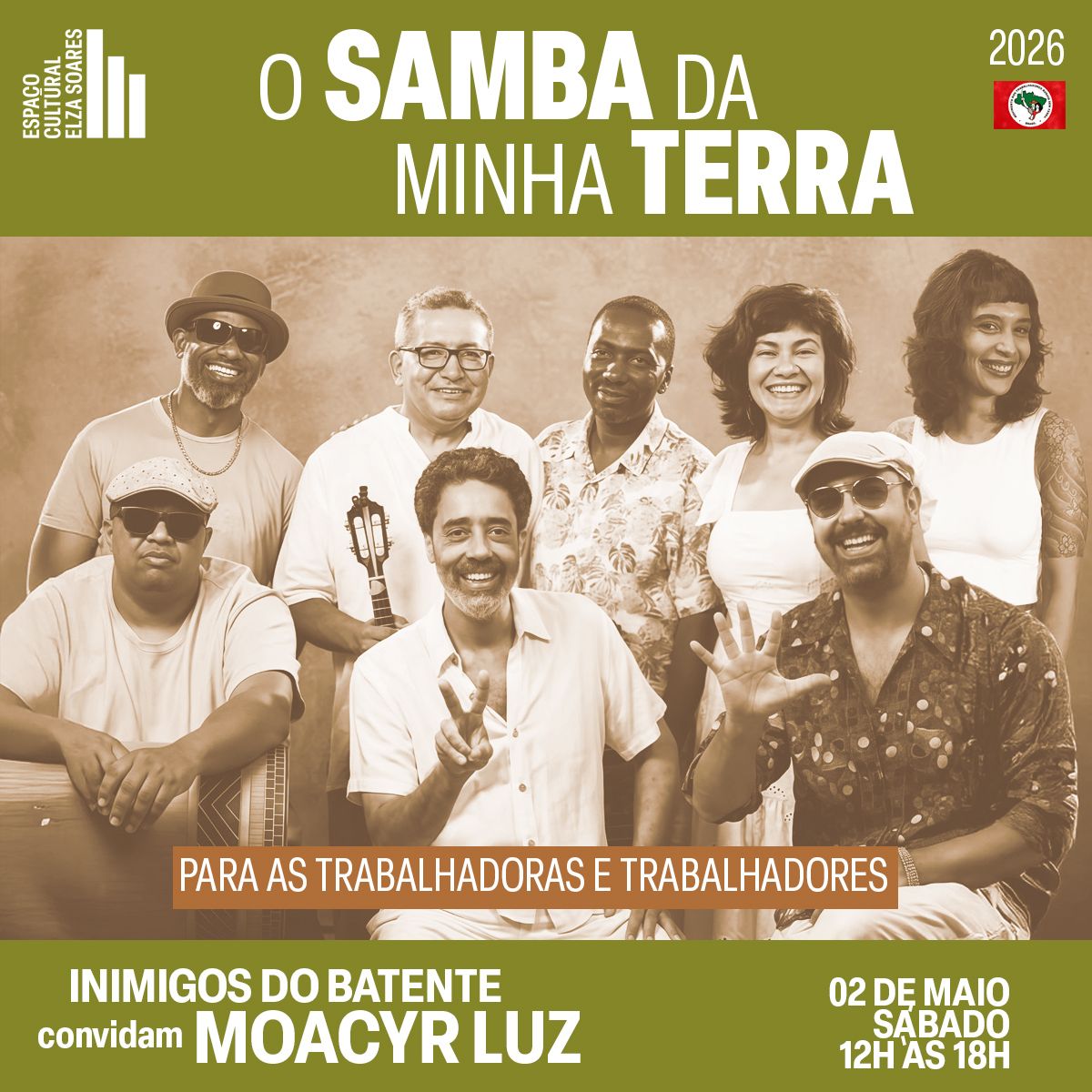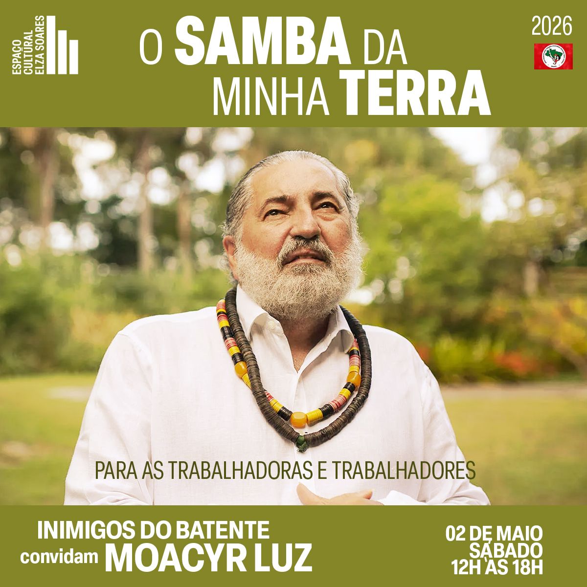No próximo dia 02 de maio (sábado), a série “O Samba da Minha Terra” realiza uma edição histórica no Espaço Cultural Elza Soares, em São Paulo. O encontro celebra a força da classe trabalhadora, tendo como anfitriões duas referências da luta política e da cultura das rodas de samba: o MST e a roda de samba Inimigos do Batente. O sambista Moacyr Luz, personalidade referencial e inspiradora do samba brasileiro, desembarca em São Paulo para receber a Medalha Beth Carvalho, homenagem criada pela série O Samba da Minha Terra.