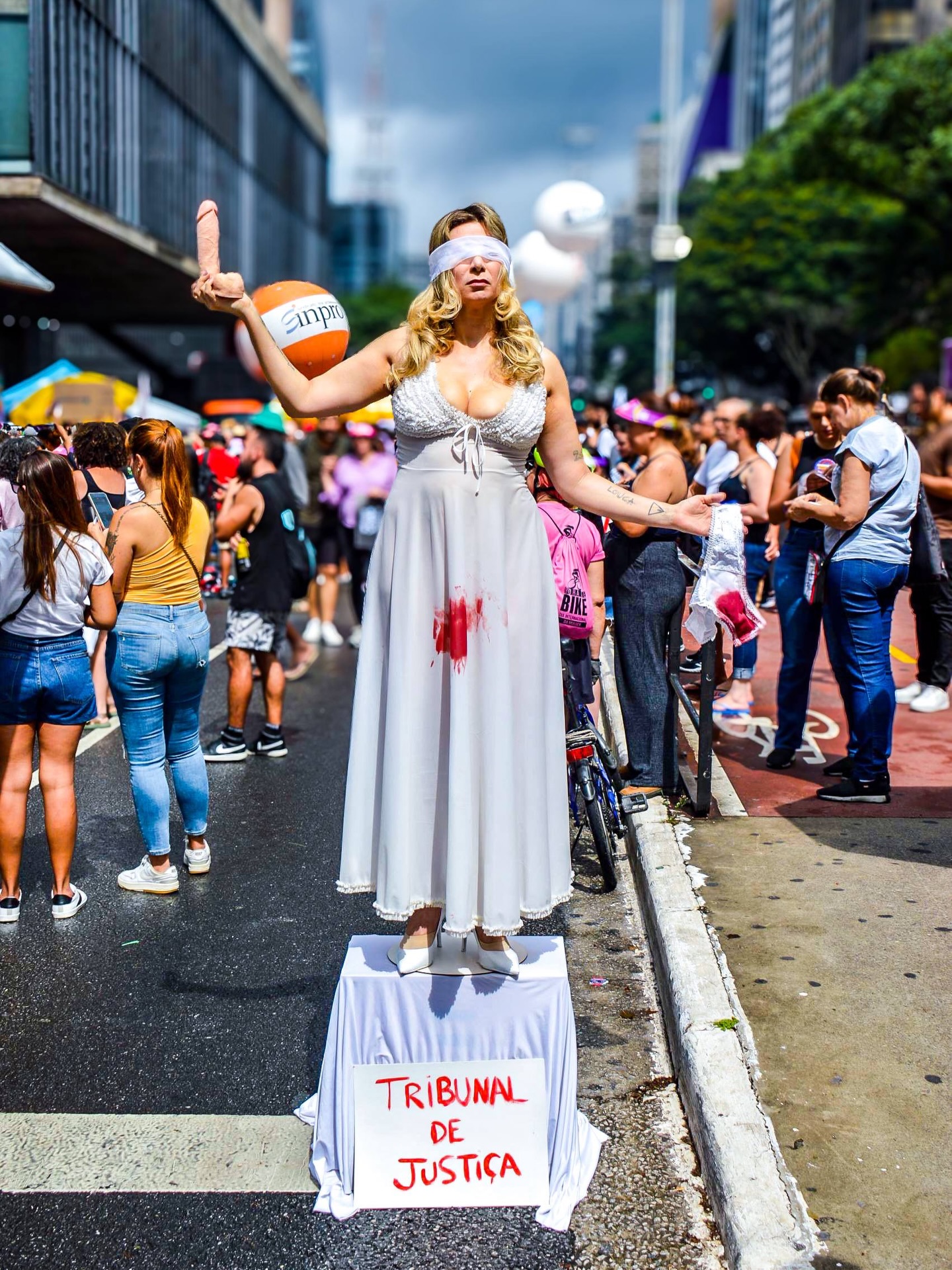 Em Porto Alegre, uma performance teatral marcou a marcha: manifestantes carregaram sapatos femininos manchados de vermelho, simbolizando mulheres assassinadas no estado, enquanto gritavam os nomes das vítimas.