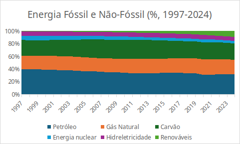 Como resultado, os ganhos de eficiência energética e uso de tecnologias limpas vêm apenas reduzindo marginalmente a participação de combustíveis fósseis na matriz energética mundial. No ano do Protocolo de Kyoto, a participação dos combustíveis fósseis na matriz energética mundial era de 85,8%, caindo apenas para 81% em 2024.