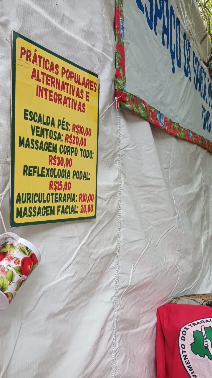 Detrás dela, perto da mesa onde os visitantes são cadastrados para receberem atendimento, tem um letreiro pendurado com os serviços de saúde que os visitantes, voluntários e feirantes podem acessar. Alguns desses são: massagens, auriculoterapia e ventosas. São realizados por terapeutas profissionais acompanhados por aprendizes capazes de replicar o ensinamento nos assentamentos,  acampamentos e outros territórios.