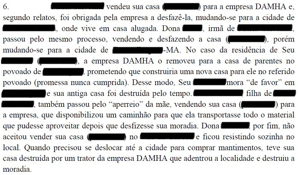 A presença da Damha na região é envolvida em denúncias por violência. Segundo relatos de moradores à reportagem, a empresa seria responsável pela derrubada de casas com uso de máquinas, presença de segurança privada armada, contaminação de rios e roçados por agrotóxicos e derrubada de vegetação nativa.