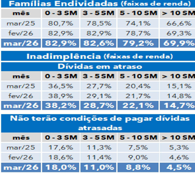 O quadro destas variáveis demonstra de forma evidente o próprio estado das desigualdades sociais e econômicas de nosso país. O percentual de famílias endividadas aumenta à medida em que se reduz o nível de renda dos grupos familiares. Assim, por exemplo, o percentual para famílias de rendimentos entre 0 e 3 salários-mínimos (sm) mensais atinge 83%, ao passo que para aqueles grupos familiares com renda mensal superior a 10 sm o percentual cai para 70%.