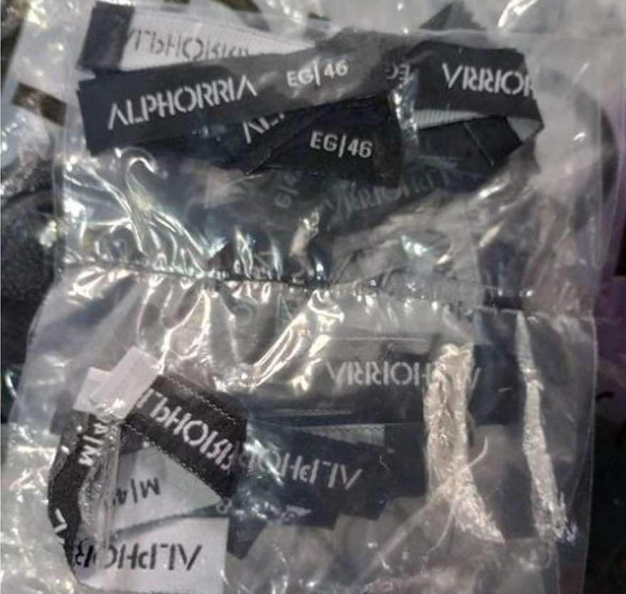 Etiquetas da Alphorria encontradas na oficina de costura fiscalizada (Foto: MTE)