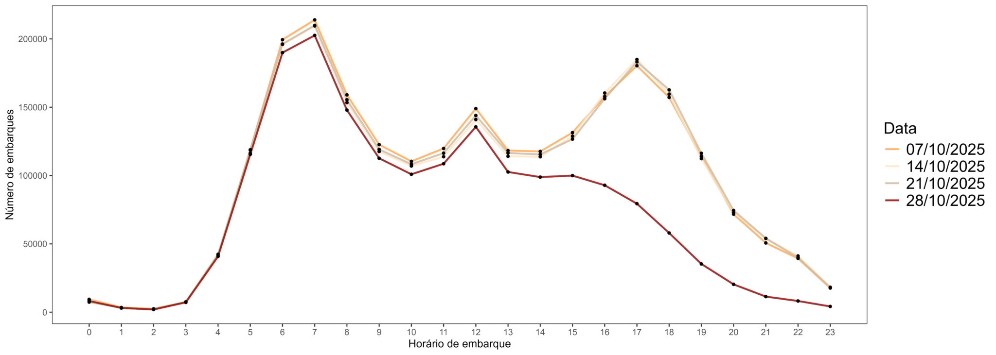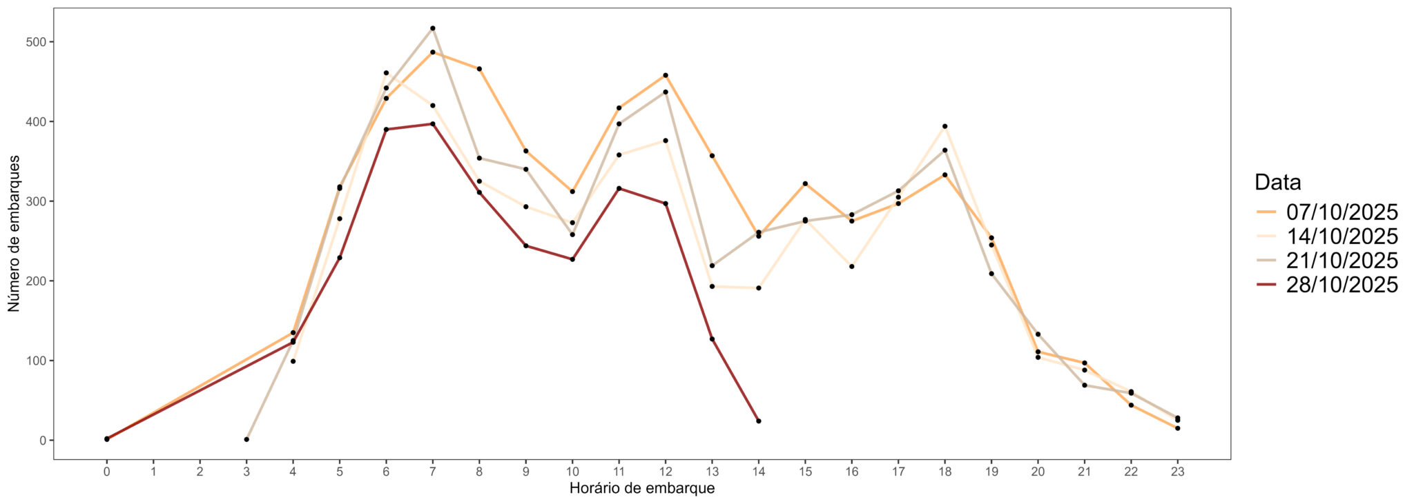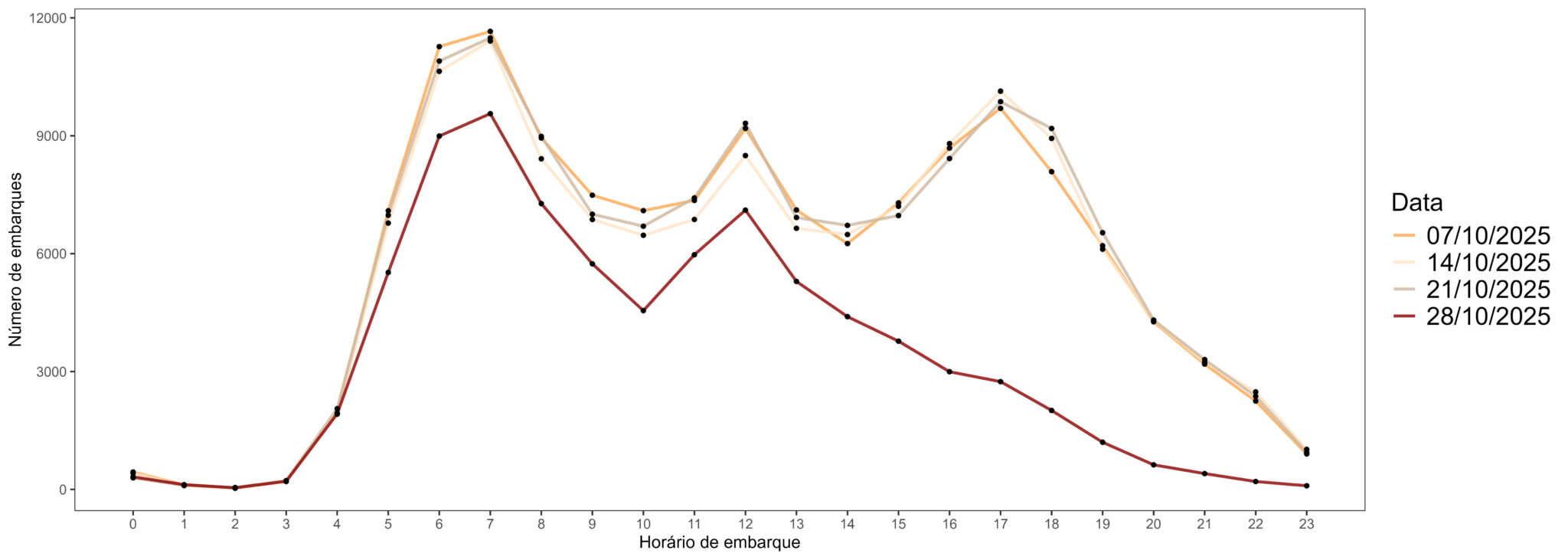 Figura 2. Número de embarques nos ônibus segundo o horário nas terças-feiras de outubro de 2025