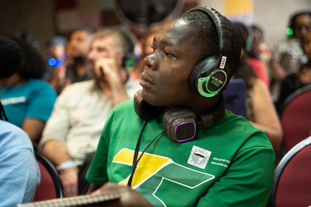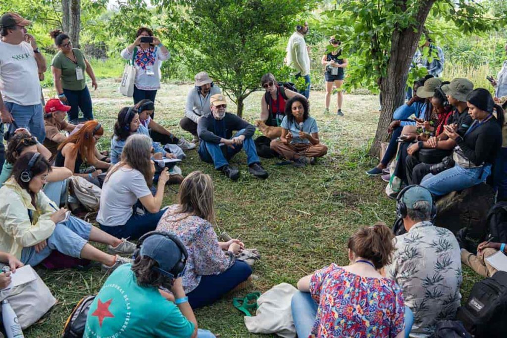 A jovem atua como guia em uma visita de intercâmbio de saberes entre organizações de 16 países, realizada no marco do Primeiro Encontro Internacional sobre Pesquisa-Ação Participativa para a Agroecologia e a Incidência Climática da iniciativa IPA-Global, que reuniu ativistas em defesa da agroecologia e da justiça climática provenientes de 16 países em Guararema (São Paulo, Brasil), no fim de 2025.