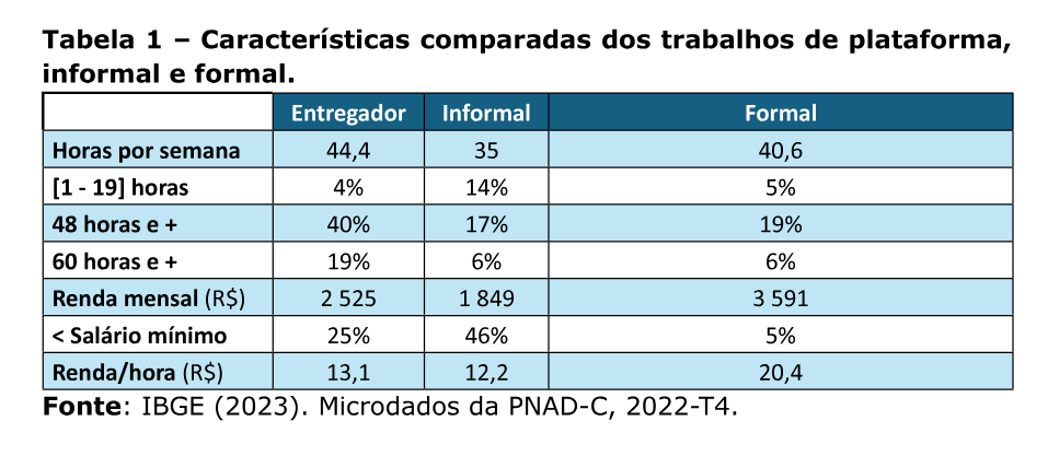 Em suma, temos nos entregadores trabalhadores mais jovens que a média do mercado de trabalho formal e informal; quase metade de chefes de família, não-brancos em sua maioria e que trabalham longas jornadas, com quase 20% deles declarando trabalhar 60 horas ou mais por semana. Essa jornada, como ocorre também com os trabalhadores formais no regime 6xl, na maioria das vezes engloba o trabalho nos finais de semana, quando a demanda por entrega de refeições aumenta significativamente.
