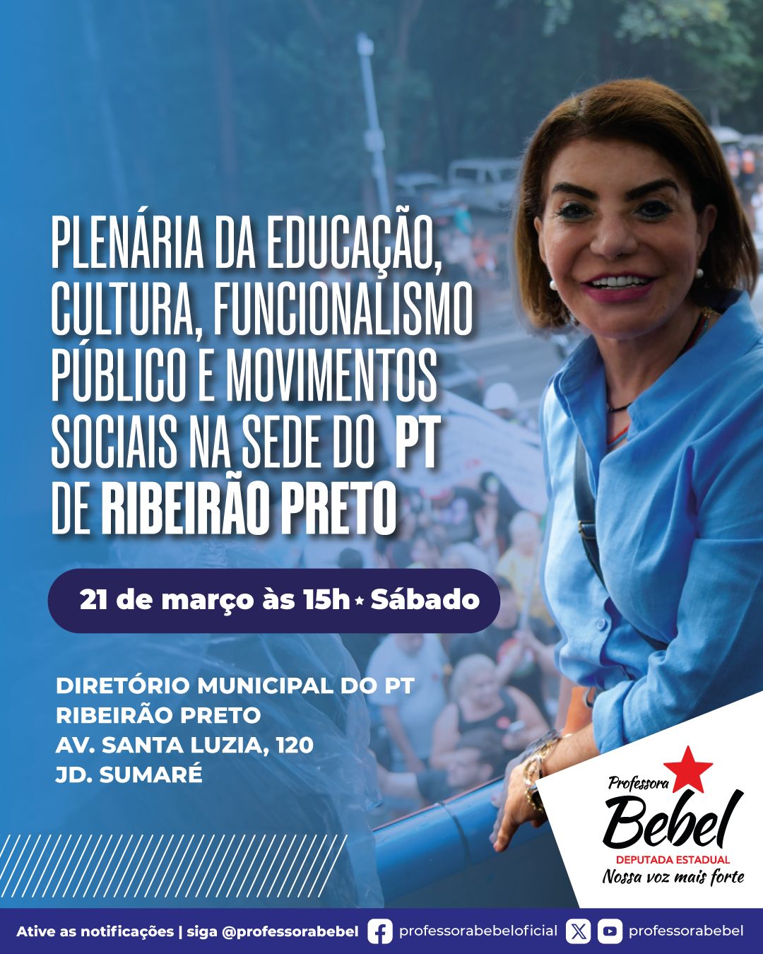 Ribeirão Preto será palco de um importante encontro de diálogo e mobilização social no próximo dia 21 de março, às 15h, com a realização da Plenária da Educação, Cultura, Funcionalismo Público e Movimentos Sociais, promovida pelo mandato da deputada estadual Professora Bebel.